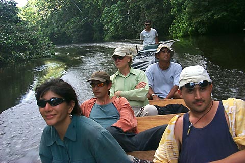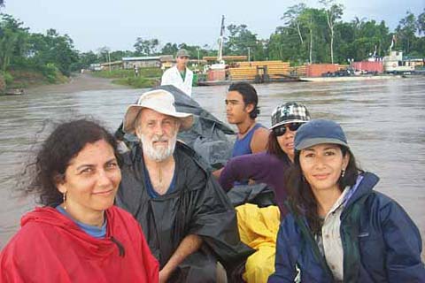Atossa Soltani and Thomas Cavanaugh of Amazon Watch, Dave Walsh of Ancient Forests International, Andrew Beath of Earthways, and Kuryanto Sri from Java cruise up the Panayacu "(Pirana Water") River en route to Panacocha ("Pirana Lakes"). Anto was with Daniel on his first Threshold evaluation of rainforest-protection projects in Indonesia in 1987. |