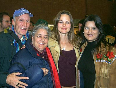 The trans-Amazon pipeline is the backdrop for this group of environmental activists on the Rio Napo: Judith Kimerling, John Seed, Martha Mondragon, and Atossa Soltani. |