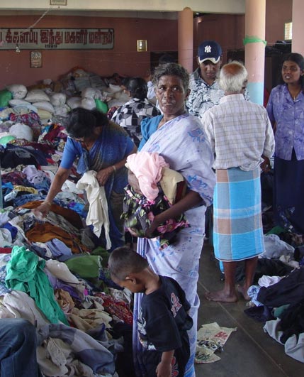 We went to the Sarvodaya headquarters last night and took some munchies we had brought from Thailand to share with the staff on duty at the Disaster Relief Center. The 10 people or so seemed appreciative, and immediately set upon the food. They were surrounded by stockpiles of donated items which have been going out to the affected areas continually.