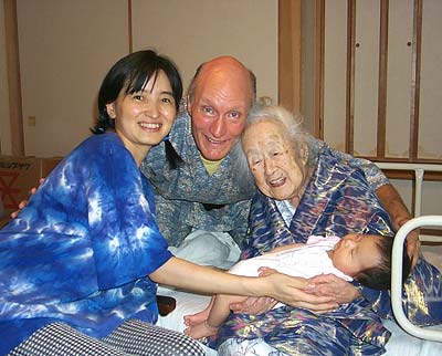Daniel with Aya Ijima and her new baby Moe, with Aya's grandmother, Mitomo-sama, 102 years old, a family friend since 1945 when she ran the "ryokan" (traditional Japanese inn) where my parents honeymooned during the US occupation of Japan.